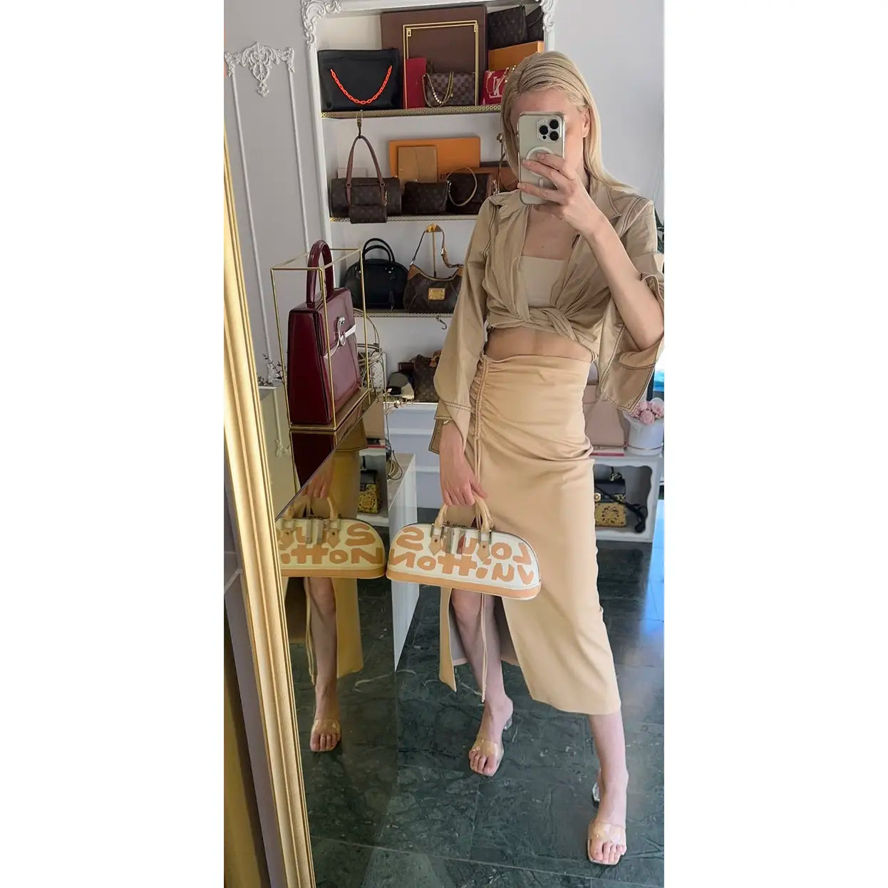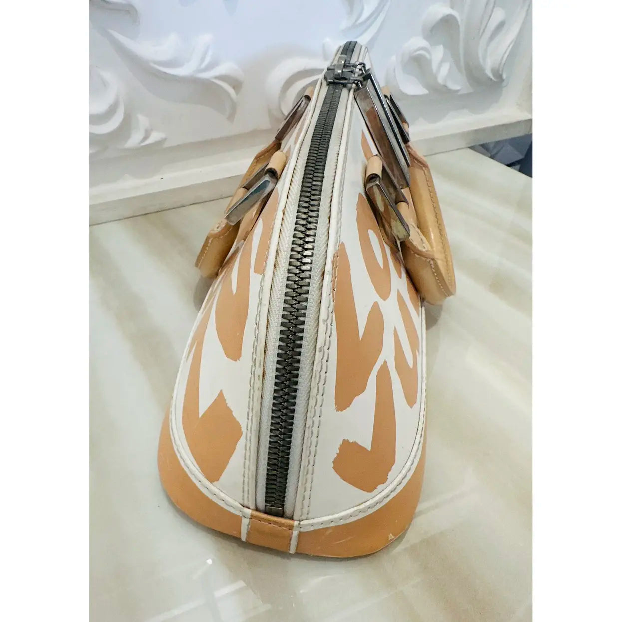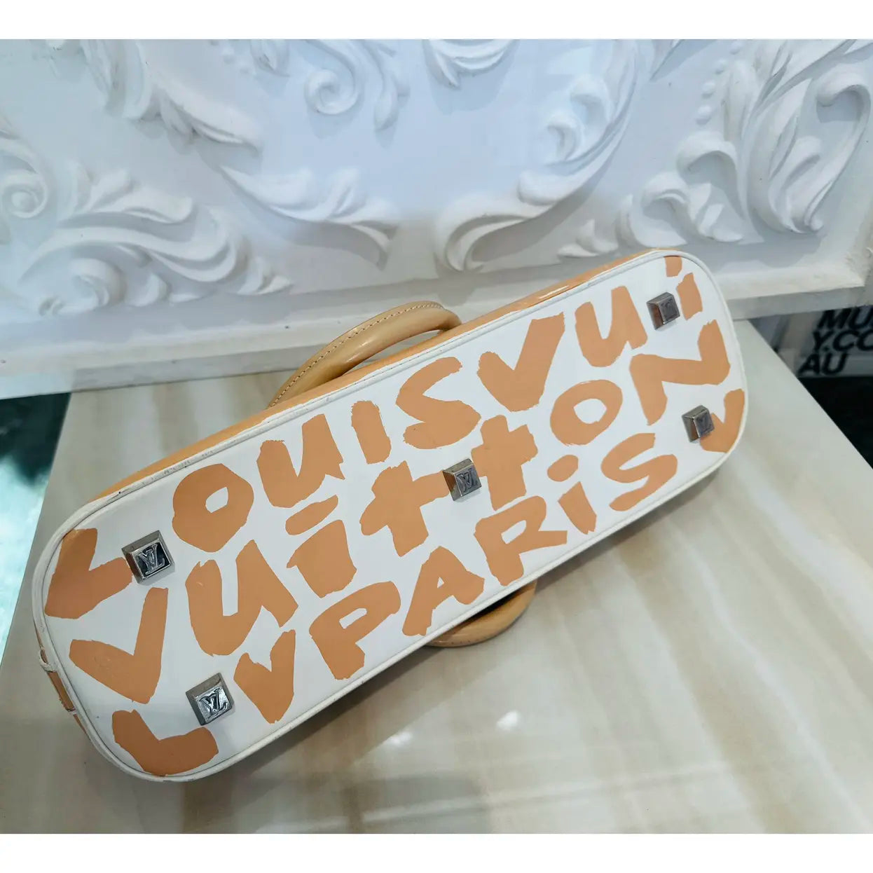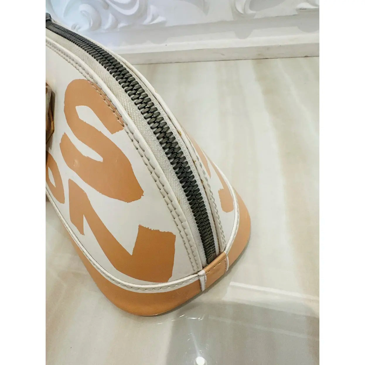 Rare y2k Louis Vuitton limited edition Stephen Sprouse Graffiti long Alma horizontal handbag in white glossy leather with a peach/salmon pink print, released as part of the 2001 collection. ✨this hard to find iconic piece features : -Rolled handles -Oversized zipper pull -Studded feet -Full zip around closure -Beige suede lining -Interior slip pocket -silver hardware ✨in very good condition with some hard to notice normal signs of wear and time such as hairline scratches on hardware and edges , glue stains near zip area etc all shown in photos ✨comes with dustbag , care booklet and material card ✨approximate dimensions : Width 37cm Height 14cm Depth 11cm