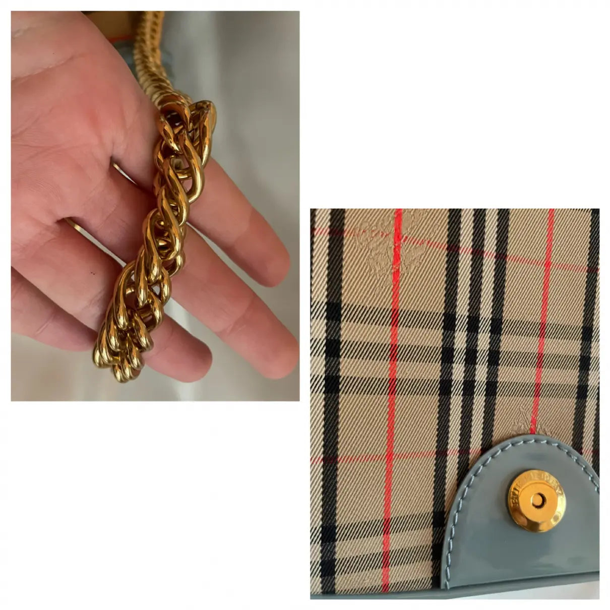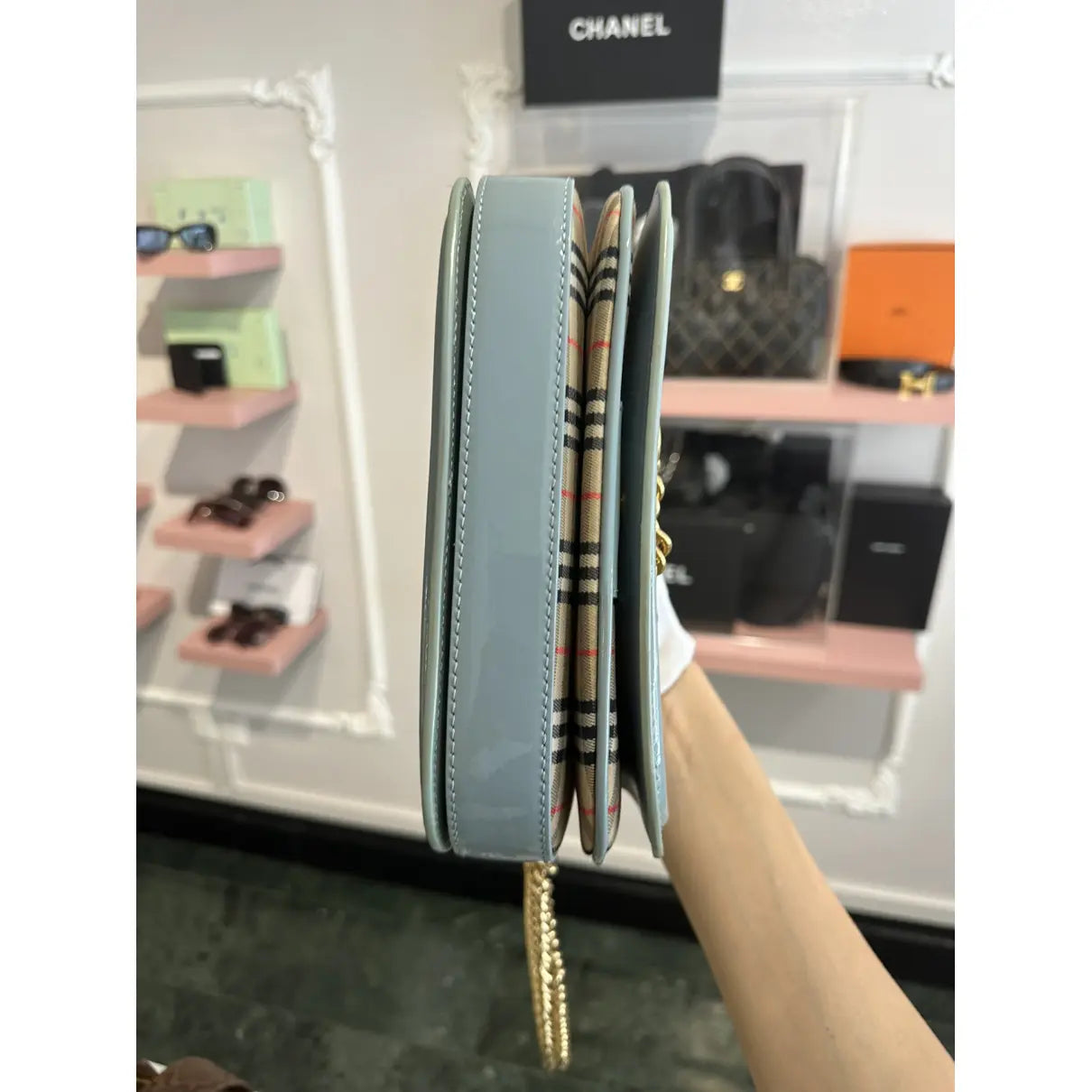 Burberry light blue/ beige The 1983 Check link flap shoulder bag with patent leather trim ✨ A stunning piece that features a shiny golden chain, calf patent leather trims and lambskin interior . This beautiful shoulder bag opens up to a zip pocket and two compartments. ✨ Comes with box, dustbag, paper wrap , maintenance guide ✨ Bag was used only 2 times and then kept in box but the color of patent leather has changed a bit at its bottom trim- shown in photo Approximate dimensions mentioned below Height 17cm Width 23cm Depth 7cm Handle drop 28cm