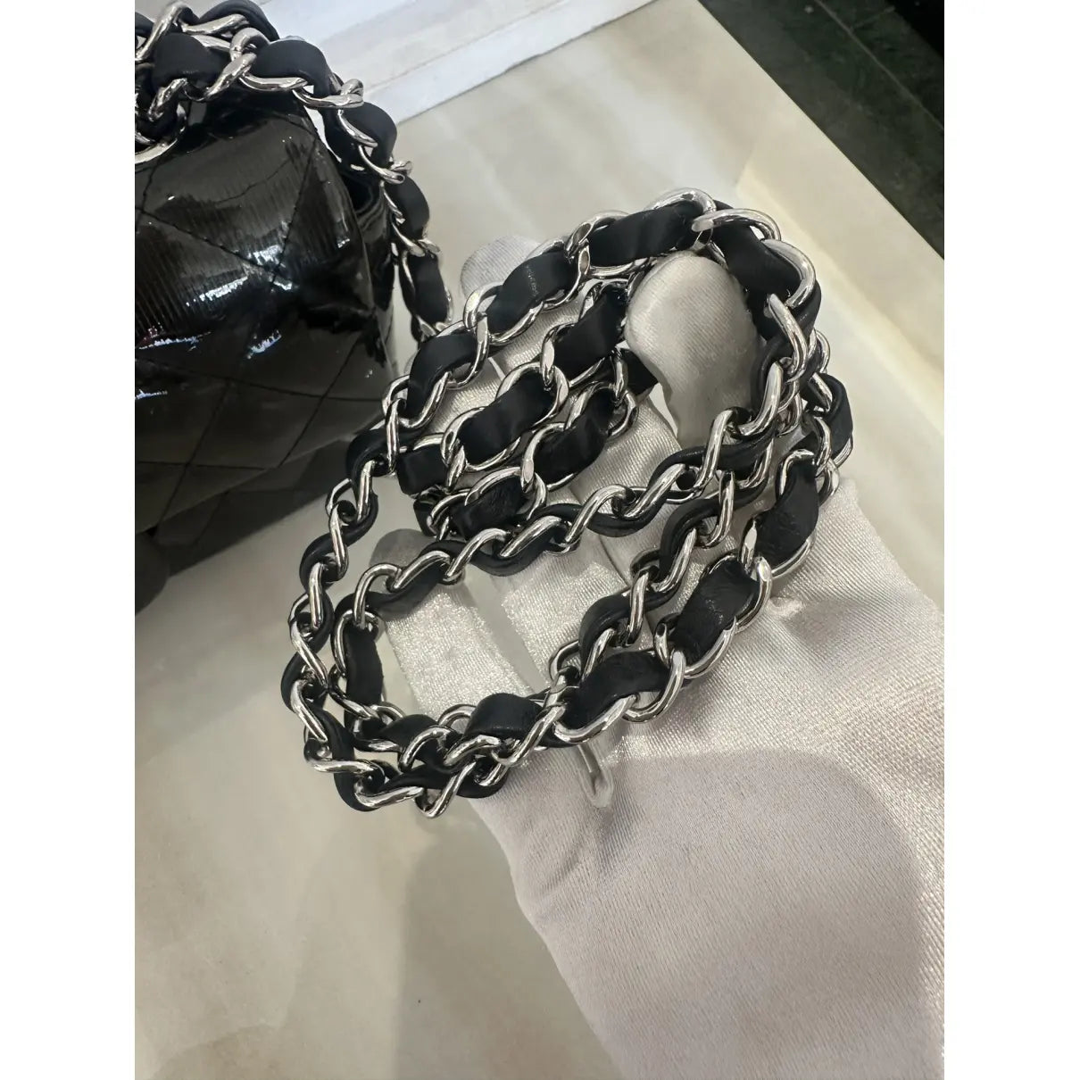 Rare CHANEL Patent leather Quilted Mini Rectangular Flap Dark Green / Grey ✨This stunning single flap small crossbody shoulder bag is finely crafted of glossy diamond quilted patent leather in dark green/grey with Black Undertones. The bag features a silver interwoven chain link shoulder strap threaded with leather and a front flap with a silver Chanel CC turn twist lock. This opens to a compact matching matte black leather interior with zipper and patch pockets. ✨ in very good condition with Dustbag , card and entrupy certificate of authenticity ✨A truly gorgeous and hard to find day to night Chanel piece 🤩