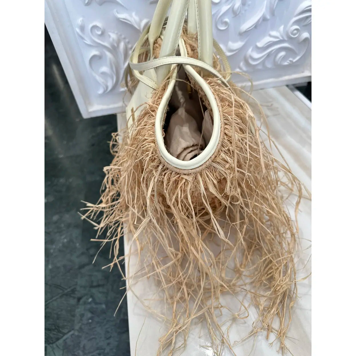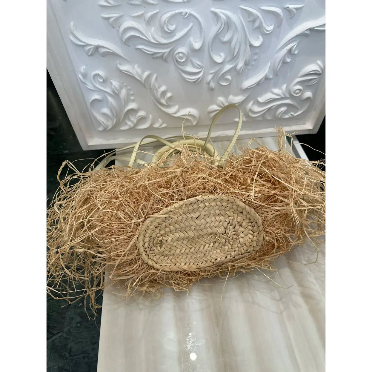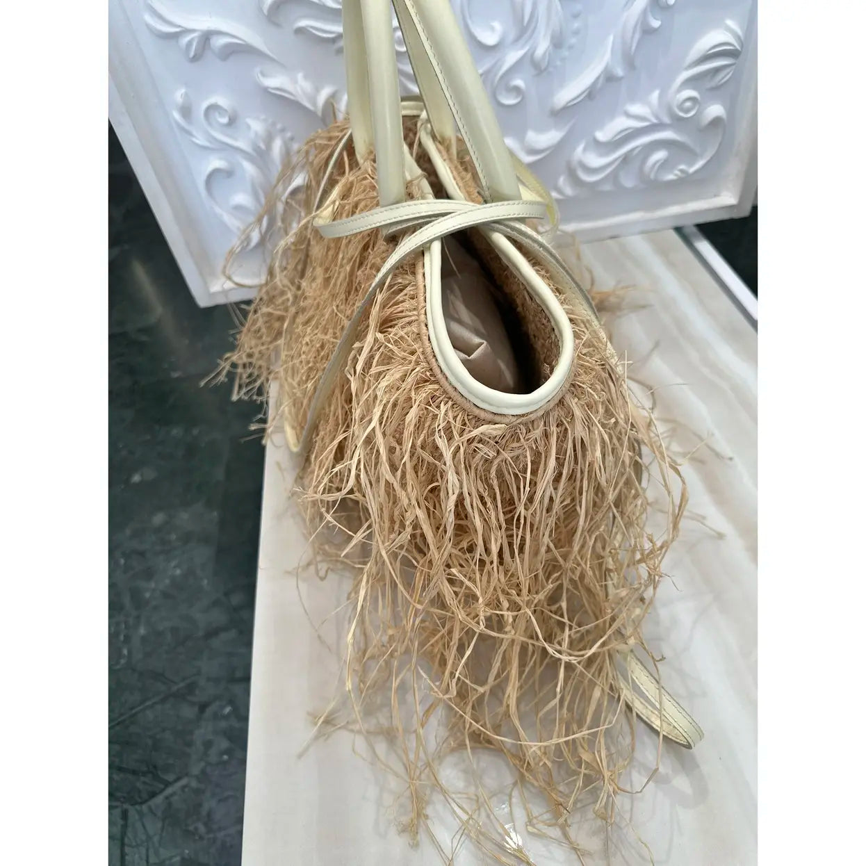 JACQUEMUS - Le Panier Soli Raphia straw wicker Tote Bag ✨This amazing summer basket bag from Jacquemus features pastel yellow, beige, raffia, calf leather, fringe detailing, adjustable detachable shoulder strap, circular top handles, gold-tone hardware, logo plaque and keyring attachment.