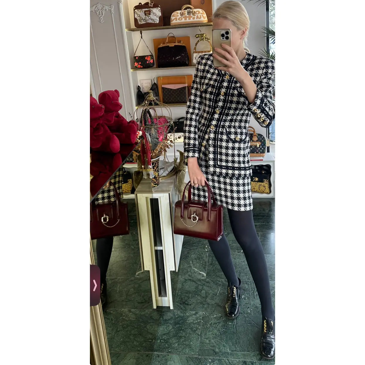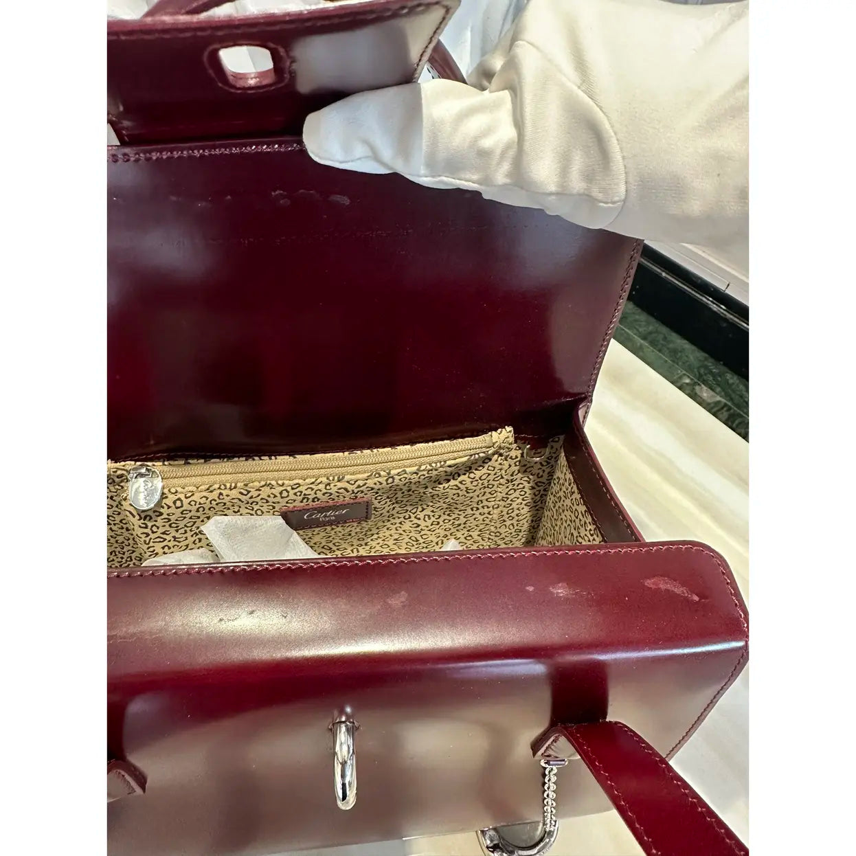 Rare Cartier Panthere Box Leather top handle Handbag in Bordeaux Dark cherry red ✨This beautiful Cartier handbag features a rich Burgundy leather exterior complemented by silver hardware. ✨In overall very good condition with some scratches and marks on leather shown in photos “This amazing retro-style satchel bag is a true work of art by Cartier, featuring a structured box design, a circular, stainless steel panther charm and two round leather top handles. The folded double top closure opens with a decoratively hanging chain fastening to reveal a spacious, leopard-print canvas lined interior compartment, with a gold-embossed logo stamp and a wide central zipped pocket and one open sleeve for all your daily essentials. This gorgeous tote bag will make you the envy of any die-hard fashionista.”