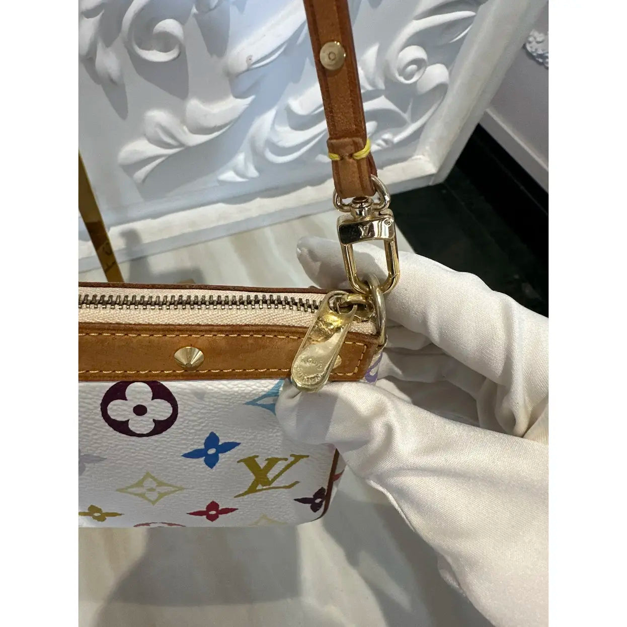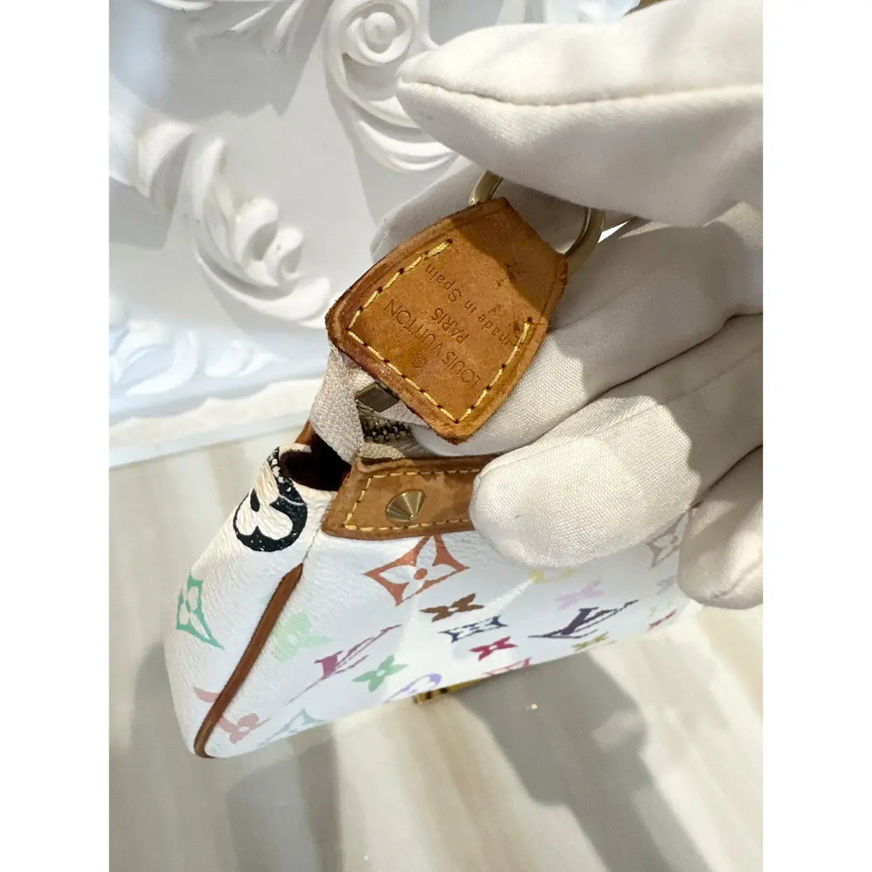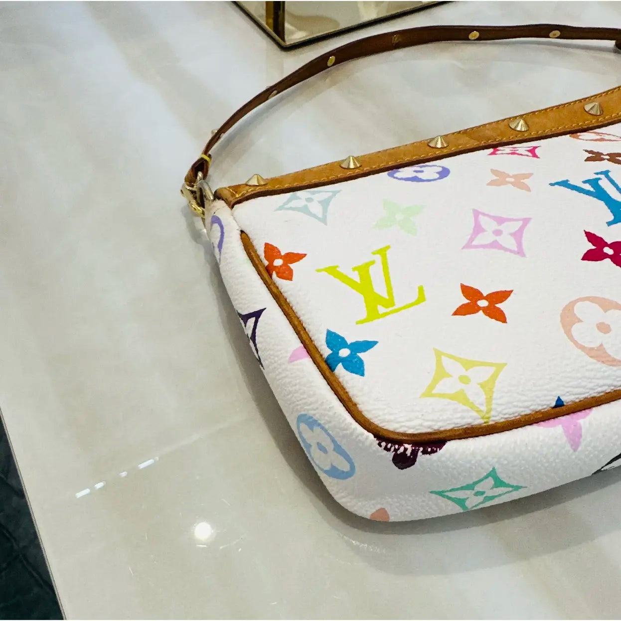 Limited edition Louis Vuitton x Takashi Murakami Multicolor Pochette Accesories ✨”Collector's piece! Everyone knows the Murakami collection is a score! Beautiful colour schemes on both sides of the bag - can match literally anything from casual to dressy! The vibrant artistry of Takashi Murakami with the harmonious blend of white canvas and playful multicolor motifs creates a dynamic and versatile accessory that effortlessly complements any outfit! “ ✨Other Features are natural vachetta leather details and gold-tone hardware, a detachable leather strap that allows it to be worn on the wrist, over the shoulder, or even used as a clutch. The interior, lined in fuchsia suede, provides a sophisticated contrast and confirms Louis Vuitton's craftsmanship. ✨in very good condition with some normal signs of wear shown in a photos such as mark on vachetta leather , light rubbing on edge etc ✨comes with dustbag ✨approximate dimensions 21 x12 x4