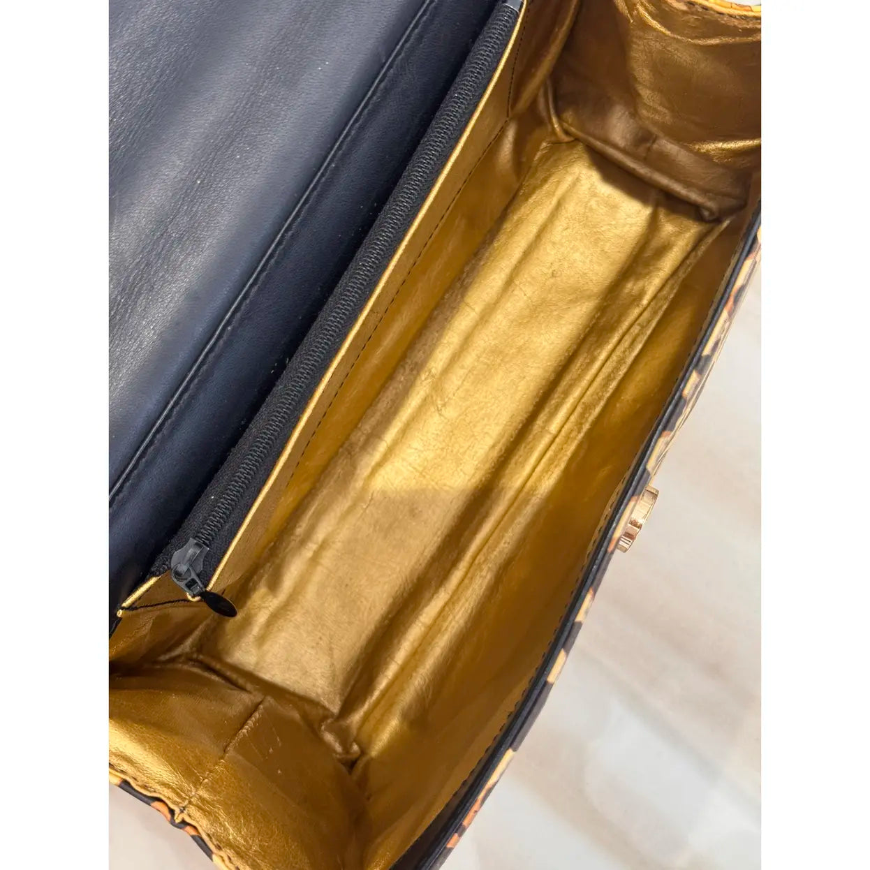 This Rare vintage iconic Gianni Versace 2way Kelly bag has it all ! A signature baroque and animal print canvas in black and yellow and Medusa motif goldtone details!