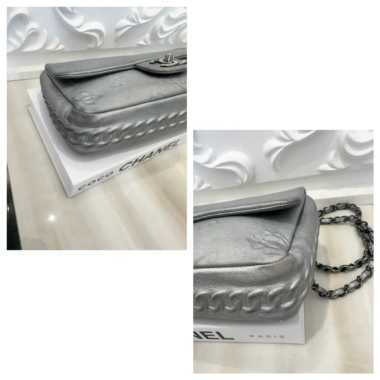 Limited Edition & RARE Chanel Medium Lucky Charms Precious Symbols Embossed Silver Leather Classic Timeless Flap Bag